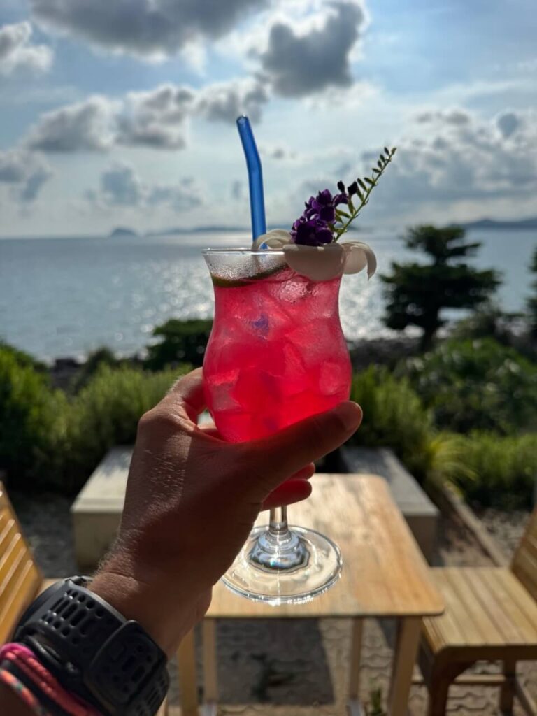 Tout au bout du chemin, Cape Tukata dévoile un cap discret. Le noir des rochers contraste magnifiquement avec le turquoise de la mer. Ensuite, à seulement quelques minutes de là, fais une pause au Ta-Lay Time, un restaurant plein de charme qui marie cuisine thaïe authentique et vue panoramique sur les îlots environnants. Sur la terrasse en bois, on savoure un curry parfumé, un poisson du jour grillé ou un wok relevé, le tout accompagné d’un cocktail. De plus, les prix restent doux (entre 120 et 220 THB), et l’accueil est chaleureux. Enfin, l’ambiance est familiale : on échange facilement avec les propriétaires, qui partagent volontiers leurs petits points de vue cachés ou quelques conseils d’exploration.